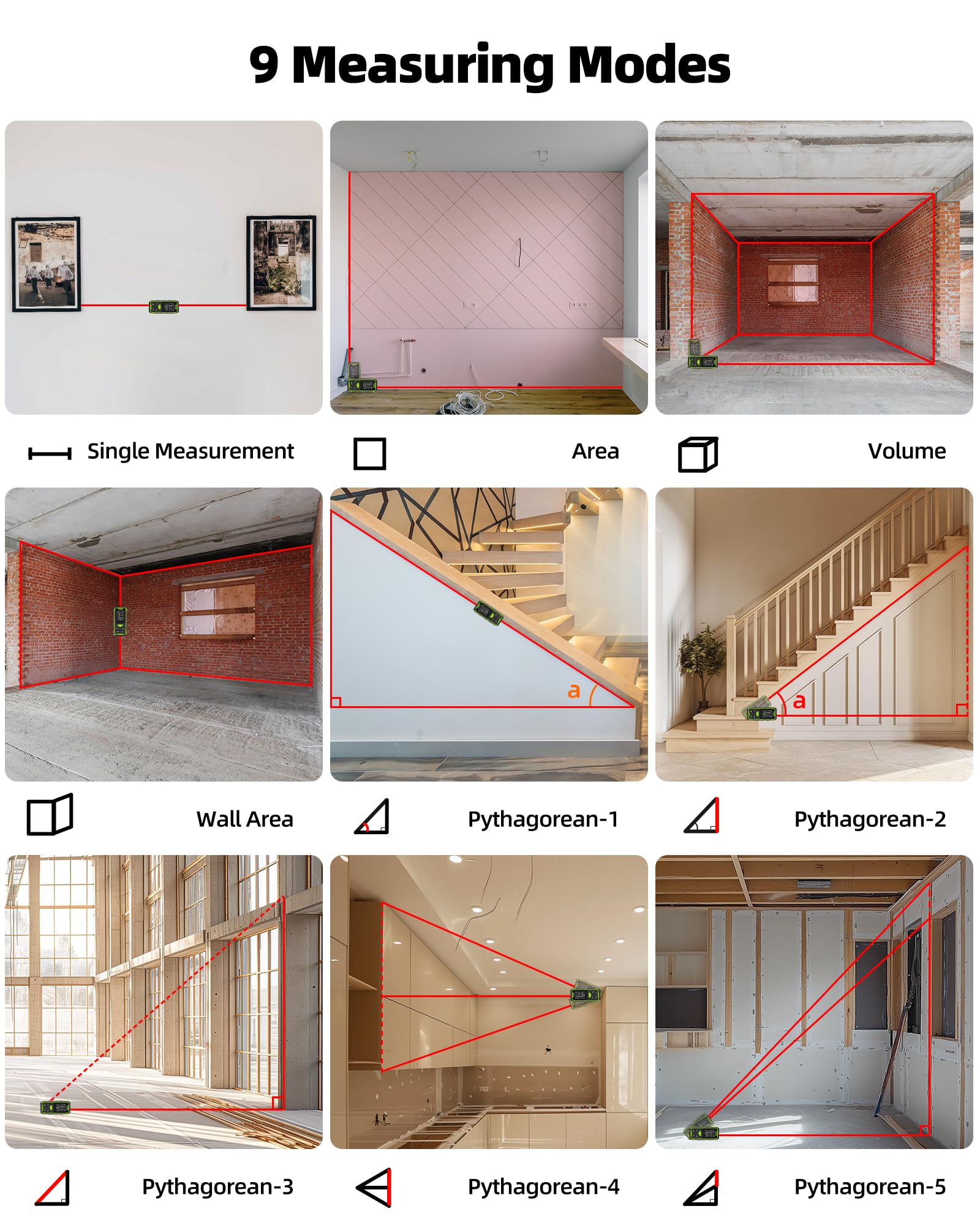 - ă9-in-1 Multifunctional Measuring ToolăThis laser measurer offers 9 modes, including length, area, volume, angle, wall area, and 4 Pythagorean modes. Features unit switching (M/In/Ft/Ft+In), 100 data storage groups, and add/subtract functions. Continuous measurement mode helps find midpoint, max & min values for precise results in construction & real estate