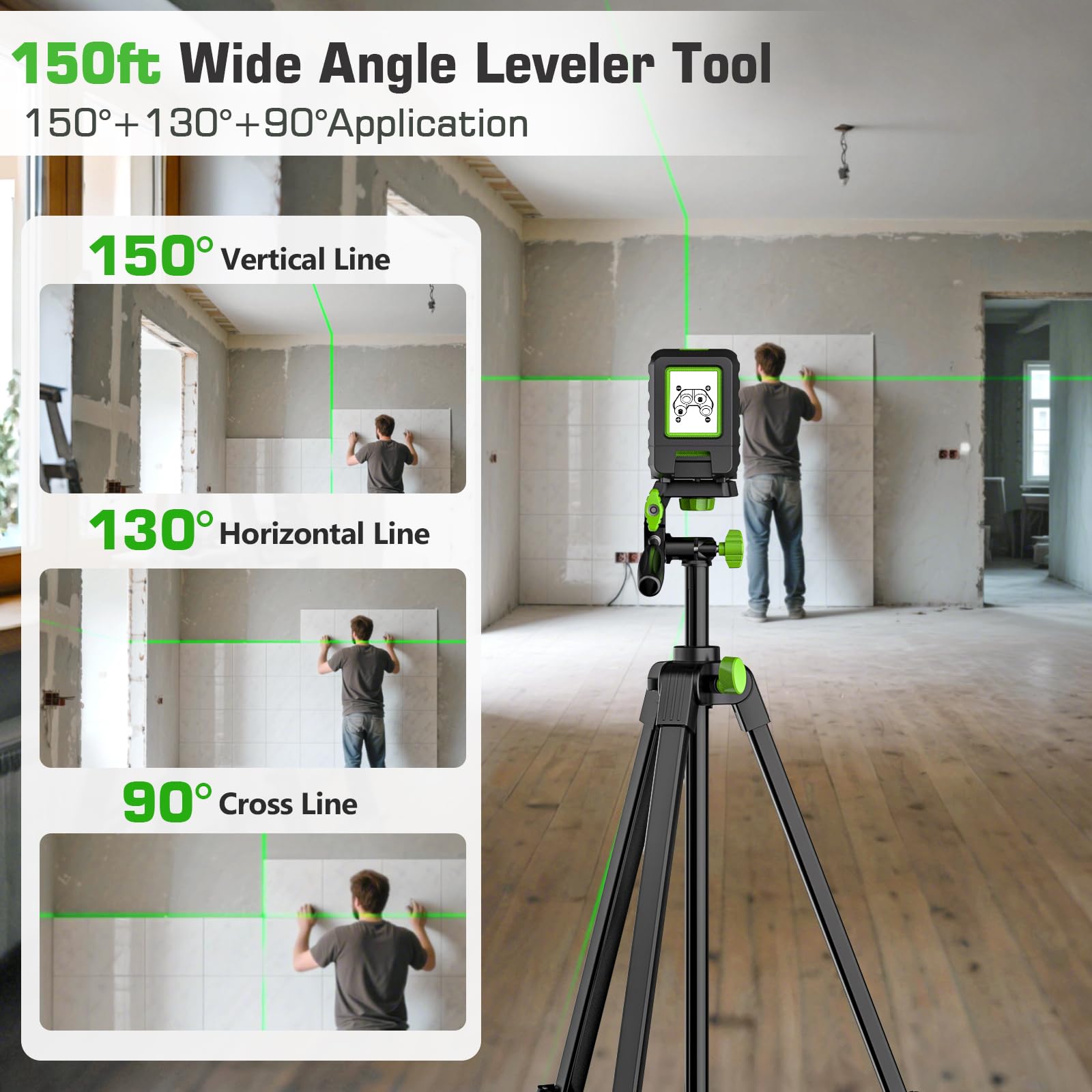 - 【150Ft Self-leveling Laser Level】Huepar BOX-1G 150 feet laser leveler will project a 130° horizontal line and a 150° vertical line when working, and equipped with a professional accuracy: ± 1/13In. at 33 Ft (±2mm at 10m). Laser level tool has bright green beam, soft grip and 47.2" drop protection, it's suitable for indoor and outdoor use. IP54 dust and water resistant, Safety Class II, 8 hour Single-line working time, 9 hour all beam line working time